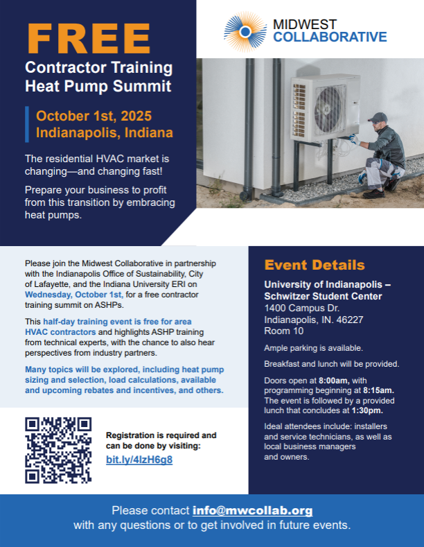 Please join the Midwest Collaborative in partnership with the Indianapolis Office of Sustainability, City of Lafayette, and the Indiana University ERI on Wednesday, October 1st, for a free contractor training summit on ASHPs. Breakfast and lunch will be provided for all attendees.
